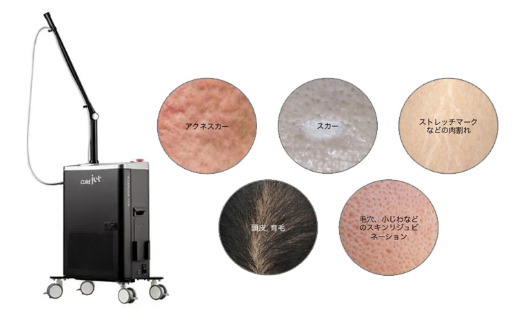 - キュアジェットは、高濃度酸素と微粒子化薬剤をジェット噴射で肌深部に届ける美肌治療